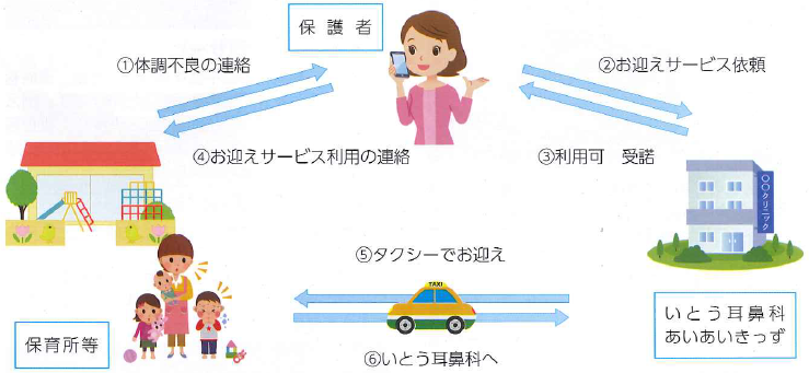 ・あいあいきっずの保育士等が保育所等にタクシーで迎えに行き、いとう耳鼻科受診後にあいあいきっずで預かります。